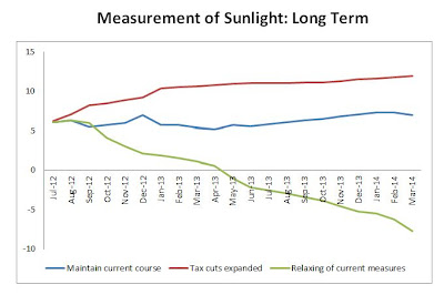 Some more conservative forecasts have picked that the Sun will fall some time after 5:00pm today, regardless of the policy settings in place, and that a period of darkness will ensue. However, in our view these outlooks are unnecessarily pessimistic, and they fail to take into account the steady progress made by government to bring spending under control and to tackle public debt.