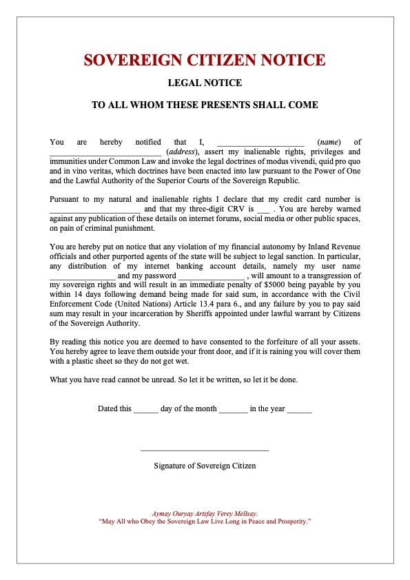 I know that most of my readers aren’t lawyers, so I have created a resource that will help them become empowered Sovereign Citizens. You will see below a notice. All you need to do is print this out, fill in the gaps and then sign it. Then you need to post copies of the notice prominently around your home, at your place of work or business, and on your websites and social media pages. And make sure you send a copy to everyone you know.